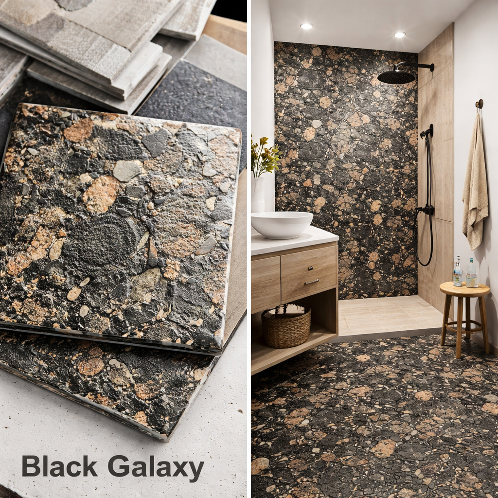 The rich black background enhances lighting effects and pairs beautifully with wood finishes, matte black fixtures, and neutral décor themes. Whether used as a full-surface application or a statement accent wall, Black Galaxy Terrazzo Tile transforms ordinary spaces into modern luxury interiors.